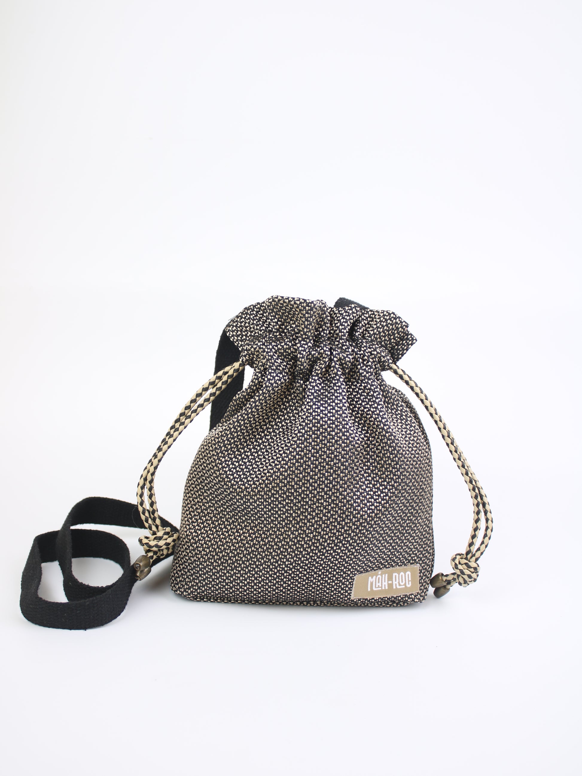 With dimensions of 22 cm x 22 cm, a strap length of 120 cm, and a drawstring length of 65 cm, this bag is designed with sustainable home decor fabric, cotton, and faux leather accents, as well as metal beads.