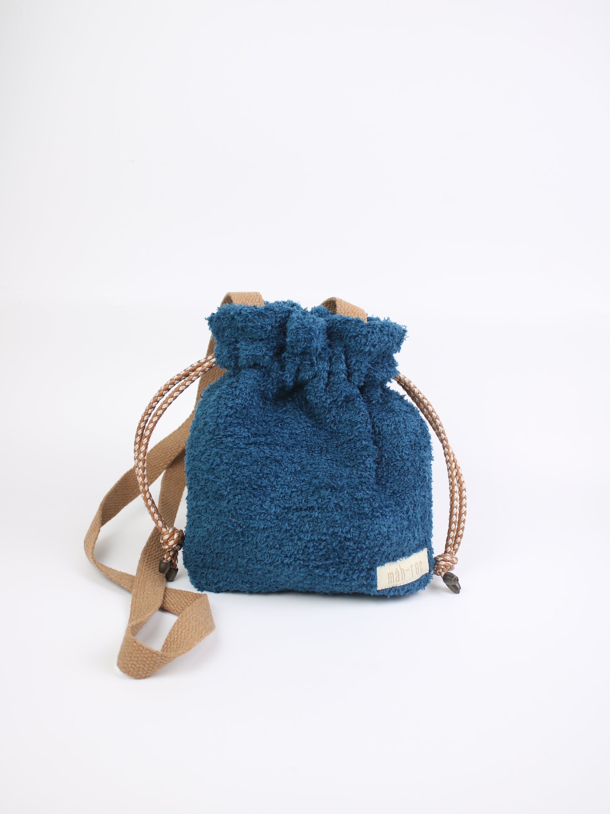 With dimensions of 22 cm x 22 cm, a strap length of 120 cm, and a drawstring length of 65 cm, this bag is designed with sustainable home decor fabric, cotton, and faux leather accents, as well as metal beads.