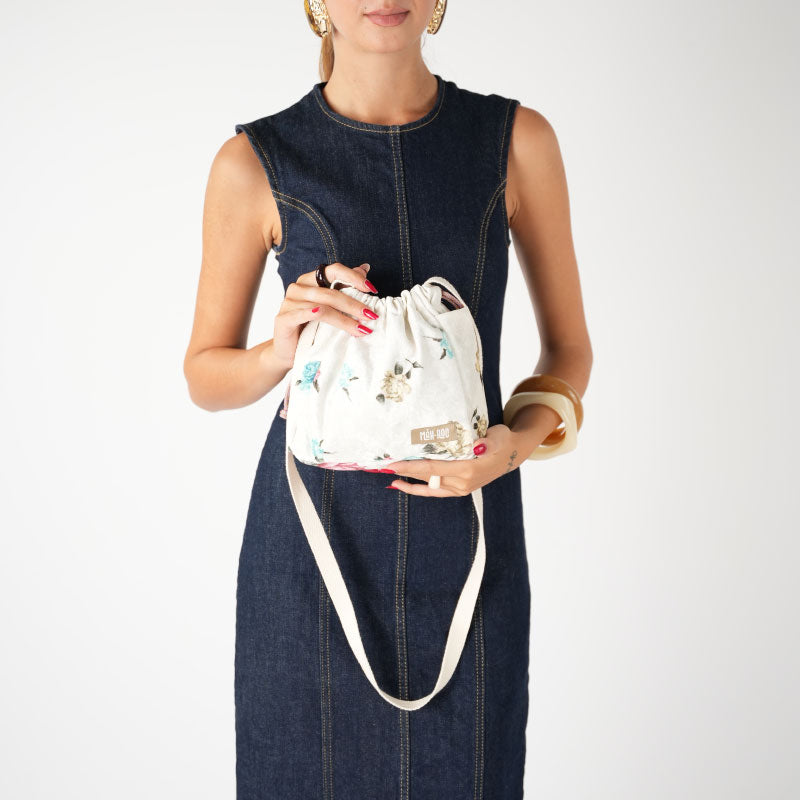 This mini bag is designed by upcycling surplus and waste fabrics from traditional Sri Lankan handlooms.