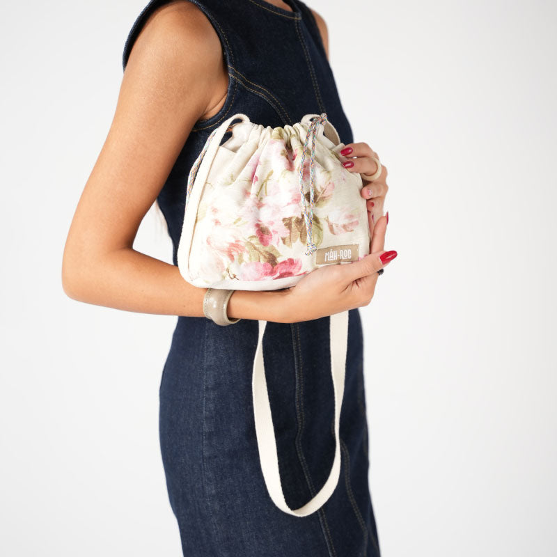 This mini bag is designed by upcycling surplus and waste fabrics from traditional Sri Lankan handlooms.